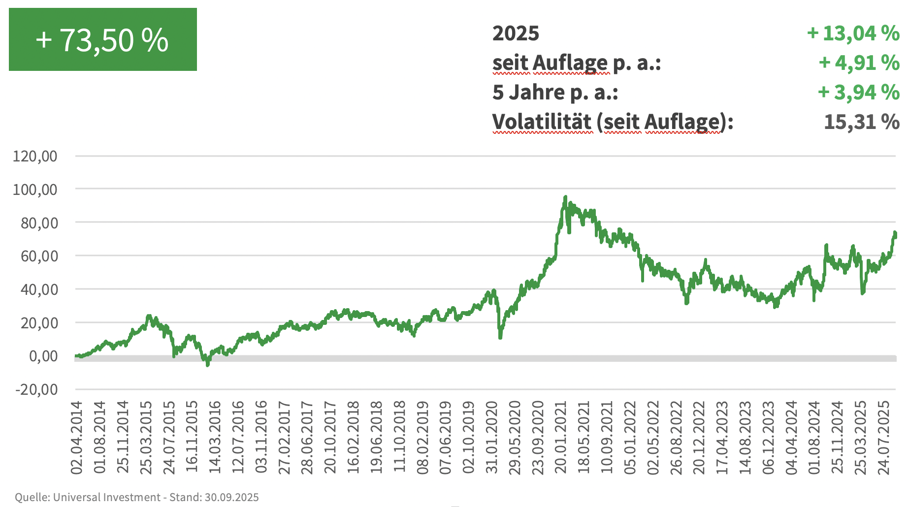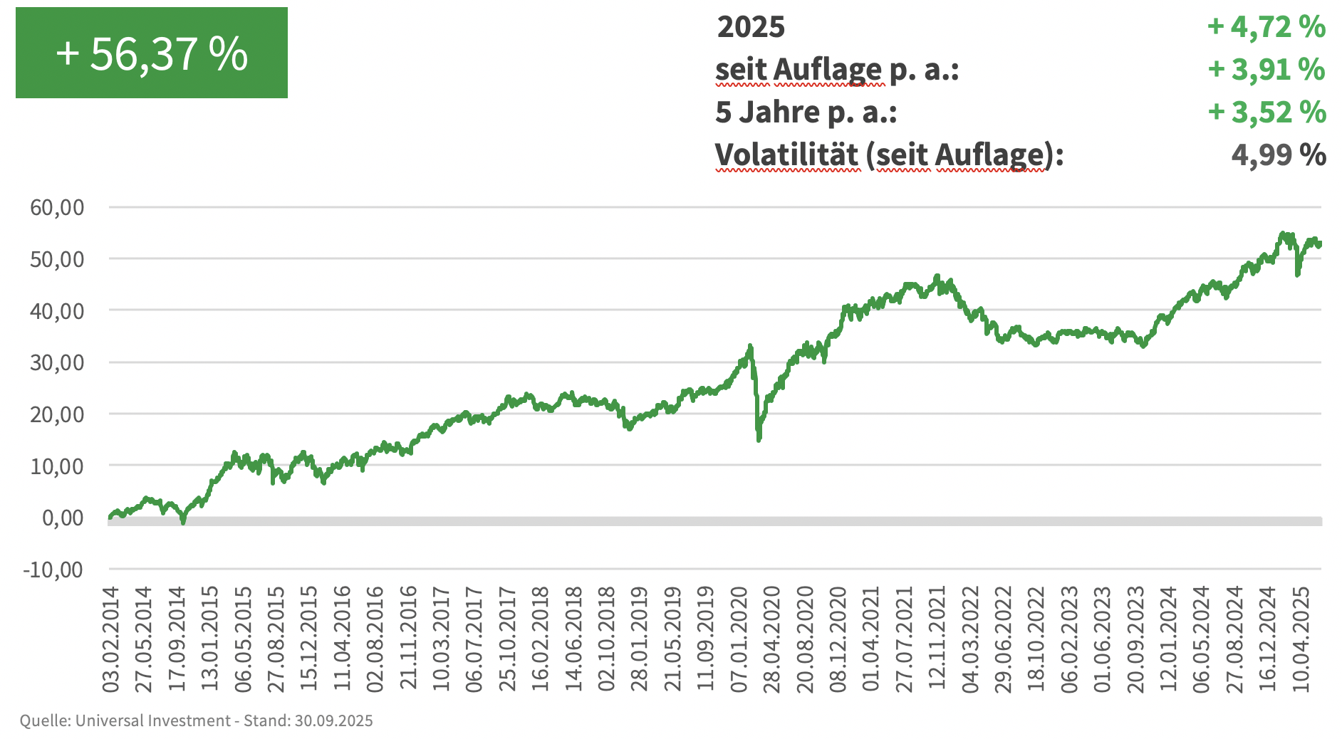 Wir sehen für das 4. Quartal weiterhin attraktive Renditechancen und liegen voll auf Kurs, mindestens die angestrebte jährliche Zielrendite von 4-6% in 2025 zu erreichen. Zu Beginn des Monats Oktober liegen die meisten Mischfondsmandate bereits bei einer Performance zwischen 5 + 6% YTD.